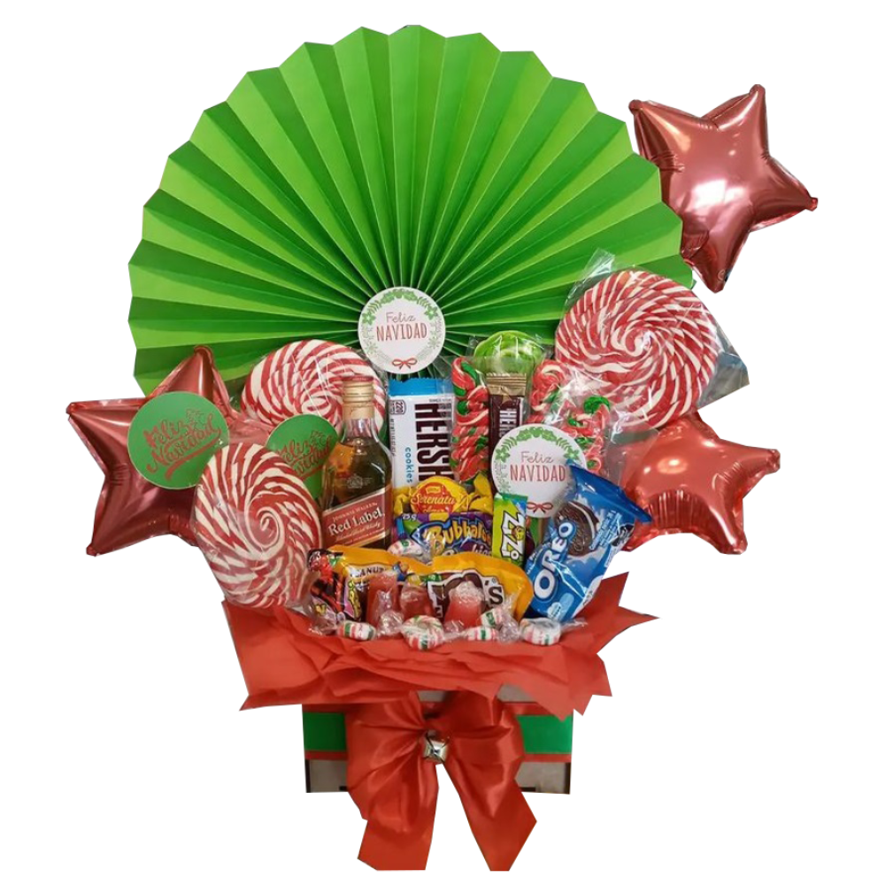 Arreglo estático con abanico y globos de 9", chocolates, dulces y paletas.